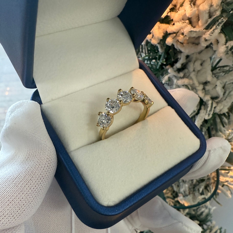 A stunning 2.50ctw curved half-eternity band featuring five Brilliant Round lab-grown diamonds at 0.50ct each. Every stone is graded VVS+ clarity, E–F color, and Excellent cut, delivering exceptional sparkle and symmetry across the design. Set in solid 14k yellow gold, this elegant curved silhouette pairs beautifully with engagement rings or wears beautifully on its own.
