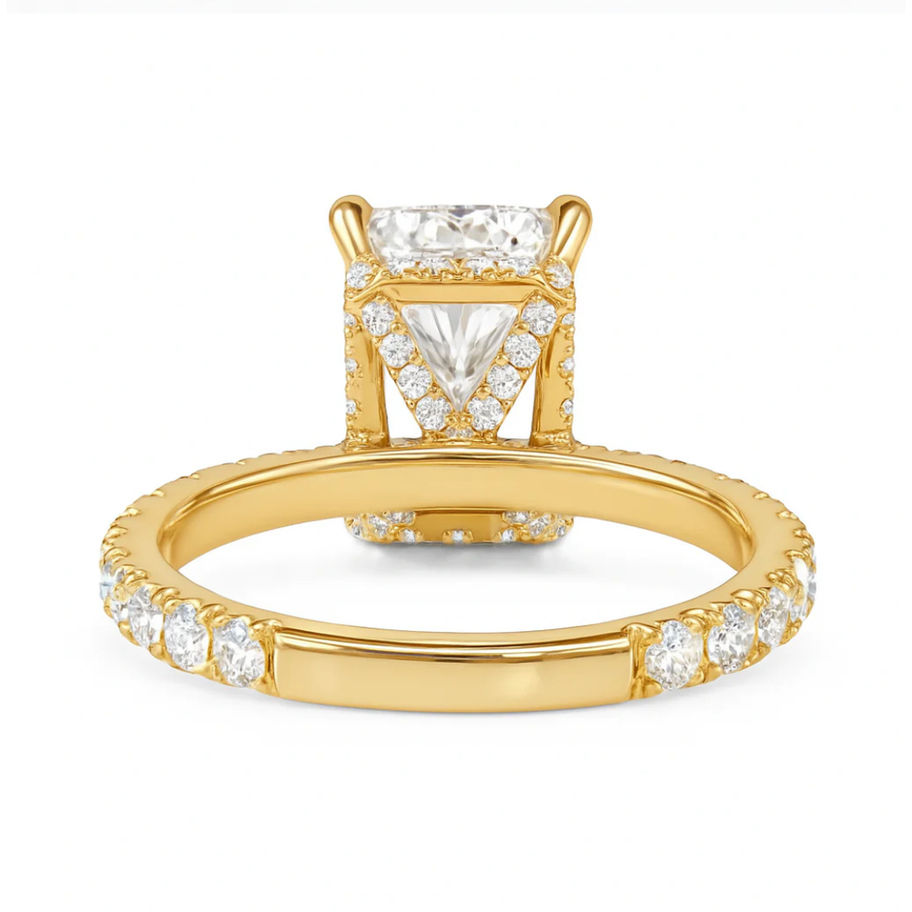 A perfect blend of elegance and modern style, Else features an elongated Cushion Cut lab-grown diamond 2ctw VVS2/E colour set within our signature hidden halo and 1.26ctw of round brilliant lab-grown diamonds that add radiant sparkle. Crafted on a delicate 2.30mm band, this stackable ring balances sophistication with contemporary flair.