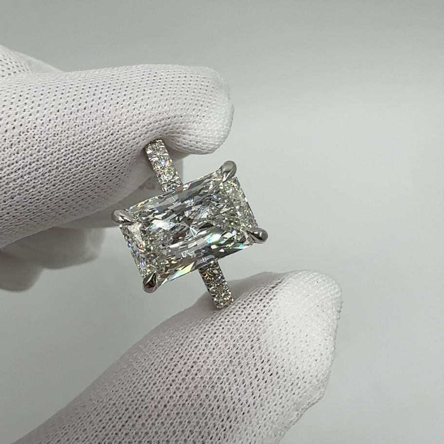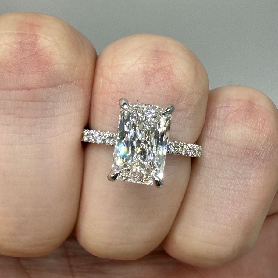 This breathtaking engagement ring showcases a 3.04ct radiant-cut lab-grown diamond at its center, masterfully set in 14K white gold. The band features an elegant pavé setting and a hidden halo beneath the center stone, adorned with 0.42ct of VVS/E lab-grown melee diamonds for extra sparkle and brilliance.
