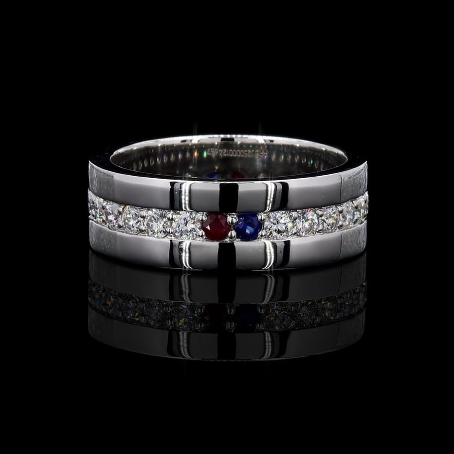 A timeless 14K white gold wedding band featuring a sleek, polished design and a shimmering row of round diamonds. Two vibrant gemstones a deep red ruby for love and passion, and a rich blue sapphire for loyalty and protection add a meaningful, personal touch to this elegant piece.